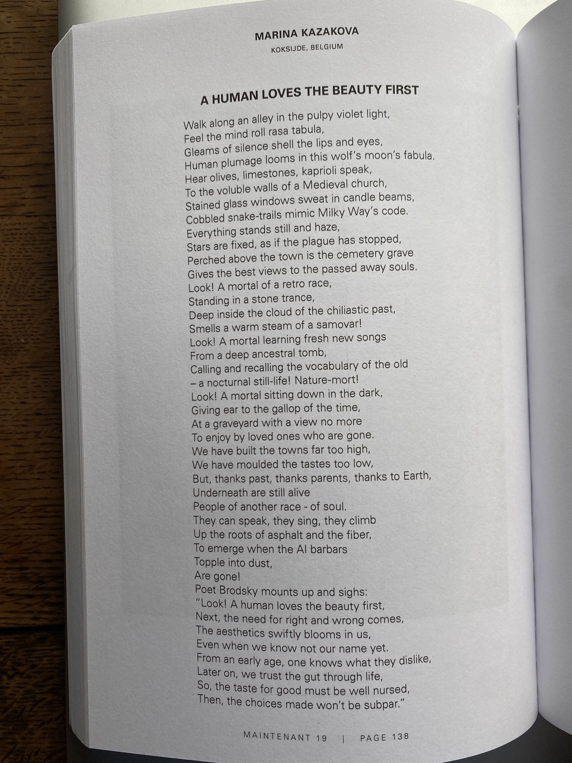 The poem “A Human Loves the Beauty First” and Sara Maino’s painting “Do-in Attento” reflecting on the theme of ETHICS CLEANSING is published in MAINTENANT 19: A Journal of Contemporary Dada Writing and Art.